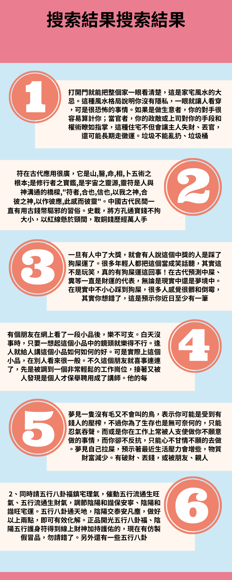 有一朋友去參加比賽,於競爭,他擔心自己無法取獲得獎項。有一天,他突然告訴我——他家狗突然四處拉屎,床上、地上遍步……。讓他生氣。我告訴他,你近日要有筆橫財來到。