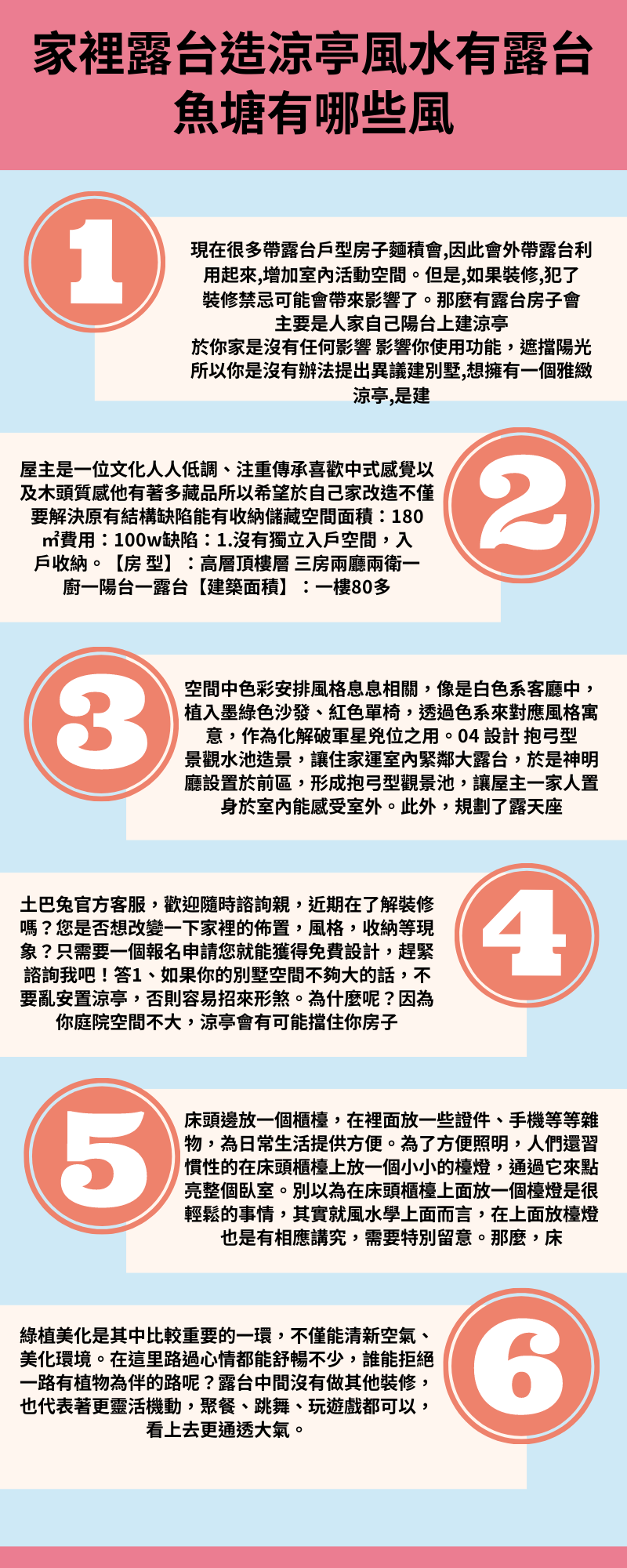 家裡露台造涼亭風水講究:色彩要講究五行之色,忌諱黑色,涼亭頂部應以圓形、五角、八角準,若是