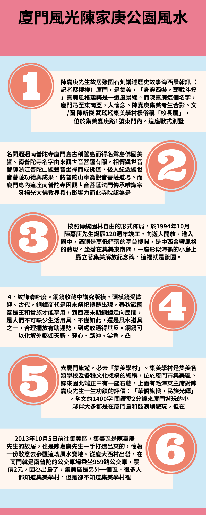 華僑領袖辦學校,集美學村耀鷺島。集美學村以為是公園,是中學。名氣集美中學,1918年創立,廈大建校歷史3年集美學村是集美各類學校及各種文化機構總稱,它愛國華僑領袖陳嘉庚先生於1913年始傾資創辦,享譽海內外。