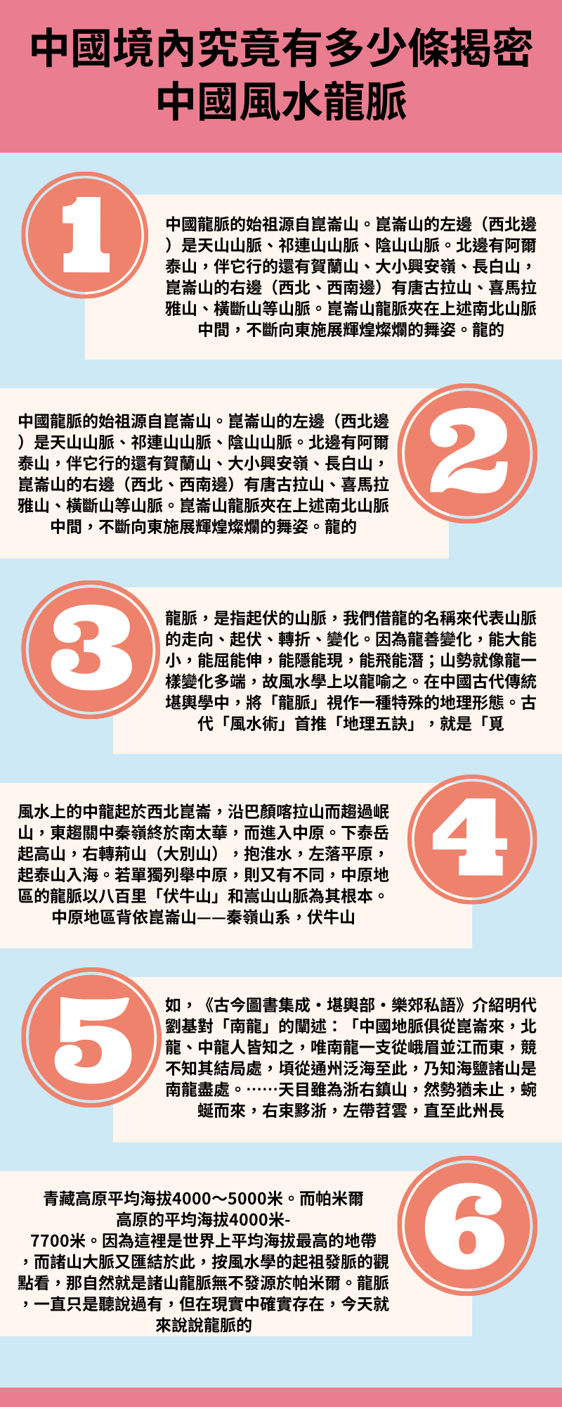 崑崙山到了中原後,向東有六盤山、秦嶺;偏北有太行山;偏南有巫山、雪峰山、武夷山;南是南嶺;加上五嶽:北岳恆山、東岳泰山、西嶽華山、中嶽嵩山、南嶽衡山。有東邊黃山和台灣玉山(海拔4000米),西南峨眉山。這些舉世聞名、舉世無雙大大小小山脈–大大小小龍脈,構成了中華巨龍圖,是龍、中小龍臥龍圖。因而,有西方個別政治家,稱中國是一條沉睡巨龍。從政治上來講是,但風水學上來講。因為它不是一條,而是一群大小不等臥龍。 40多年前,它們睡迷迷糊糊,中華民族進走向落後。現在群龍甦醒,我們民族要復興;落後走向進!