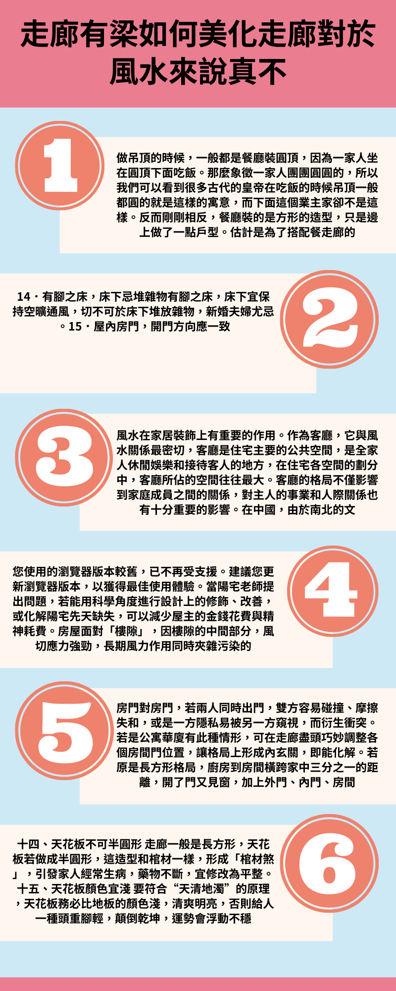 室內走廊內忌有橫樑外露,如果走廊內出現橫樑,會使人心理有壓迫感,家人會出現壓力,做事順利,宜做天花板掩飾、補平,可增加美觀。
