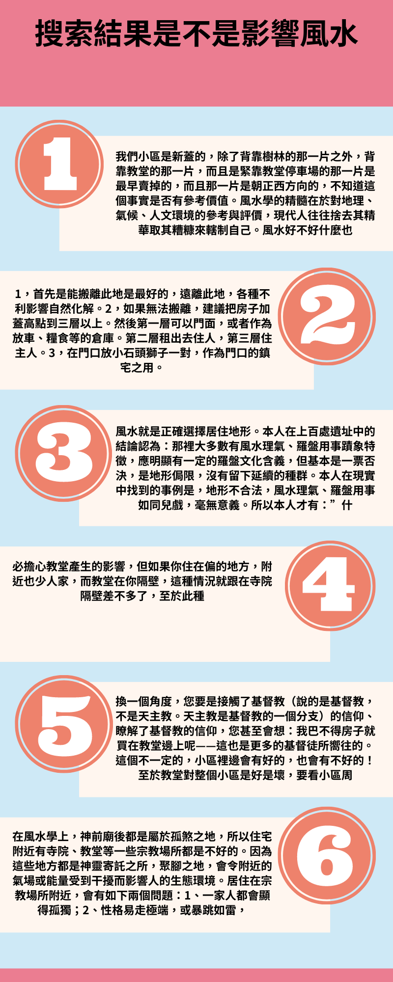 風水學上,神前廟後是屬於孤煞之地,所以住宅附近有寺院、教堂一些宗教場所是。因為這些地方是神靈寄託,聚腳地,會令附近氣場或能量受到干擾而影響人生態環境。居住宗教場所附近,會有如下兩個問題:1、一家人會顯得孤獨;2、性格走端,或暴跳如雷,或十分,人欺負。