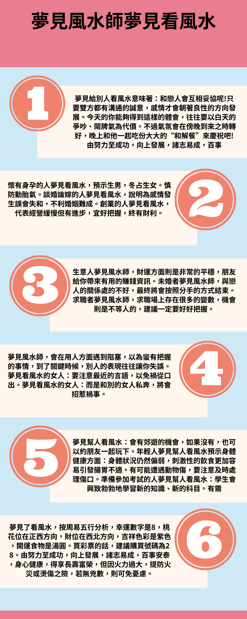孕婦夢見看風水,工作上需要一些外部資源協助,以期能夠順利完成任務;而公司獲利狀況,讓大家可以安心工作。人事溝通互動上,可透過傾聽,順利解決同仁之間誤解。另外職場上表現,只要放鬆,能達成工作目標了。