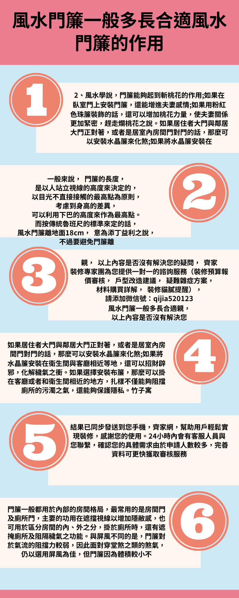 來說,門簾長度,是人站立視線高度來決定,目光直接接觸點原則,考慮到身高差異,可以利用下巴高度來作為點。而傳統魯班尺標準來定話,風水門簾離地面18cm,意為添丁益利說,不過要避免門簾離地15cm,風水上說這是官鬼,失脫數,易犯小人官司,財祿洩敗;但是如果門高度兩米話,那麼門簾高度從上框向下超過1.5米。