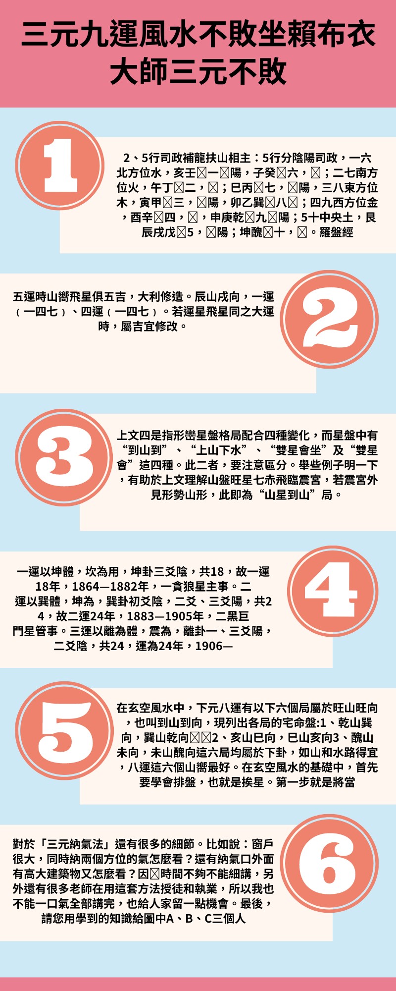 三元不敗概念和原則:坐山挨星,上下兩元陰陽順逆原則,水口星每運關係,這是三元空風水論成敗關鍵。