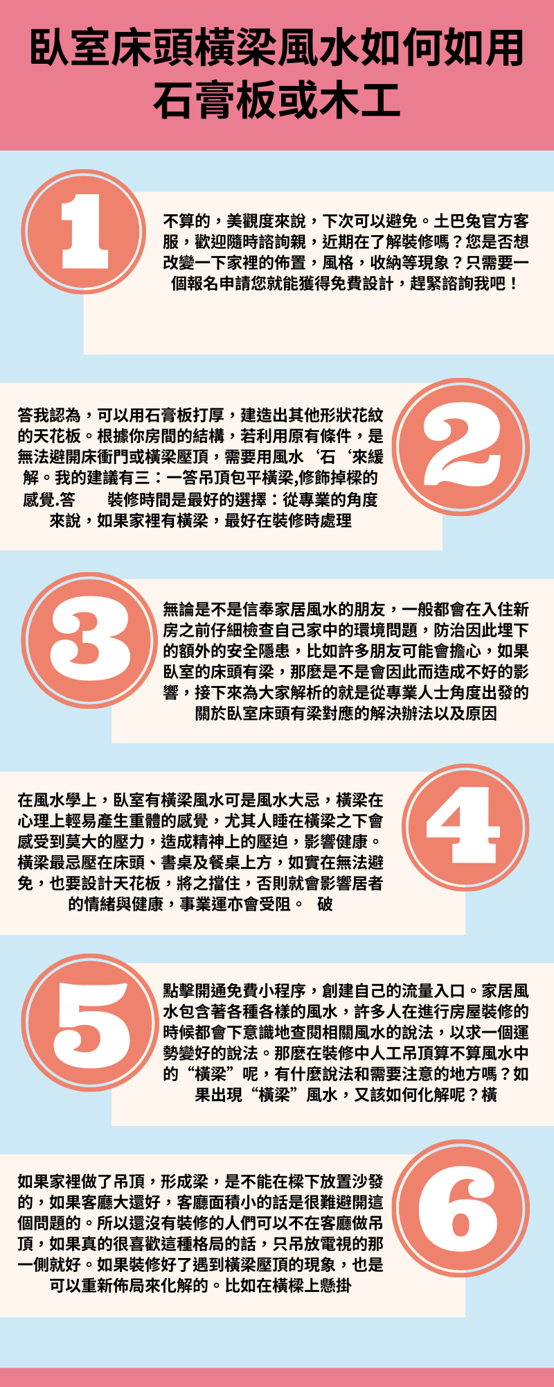 風水學上,臥室有橫梁風水可是風水大忌,橫梁心理上產生感覺,人睡橫梁之下會感受到莫大壓力,造成精神上壓迫,影響。橫梁忌壓床頭、書桌及餐桌上方,如實在無法避免,要設計天花板,擋住,否則會影響居者情緒,事業運會受阻。