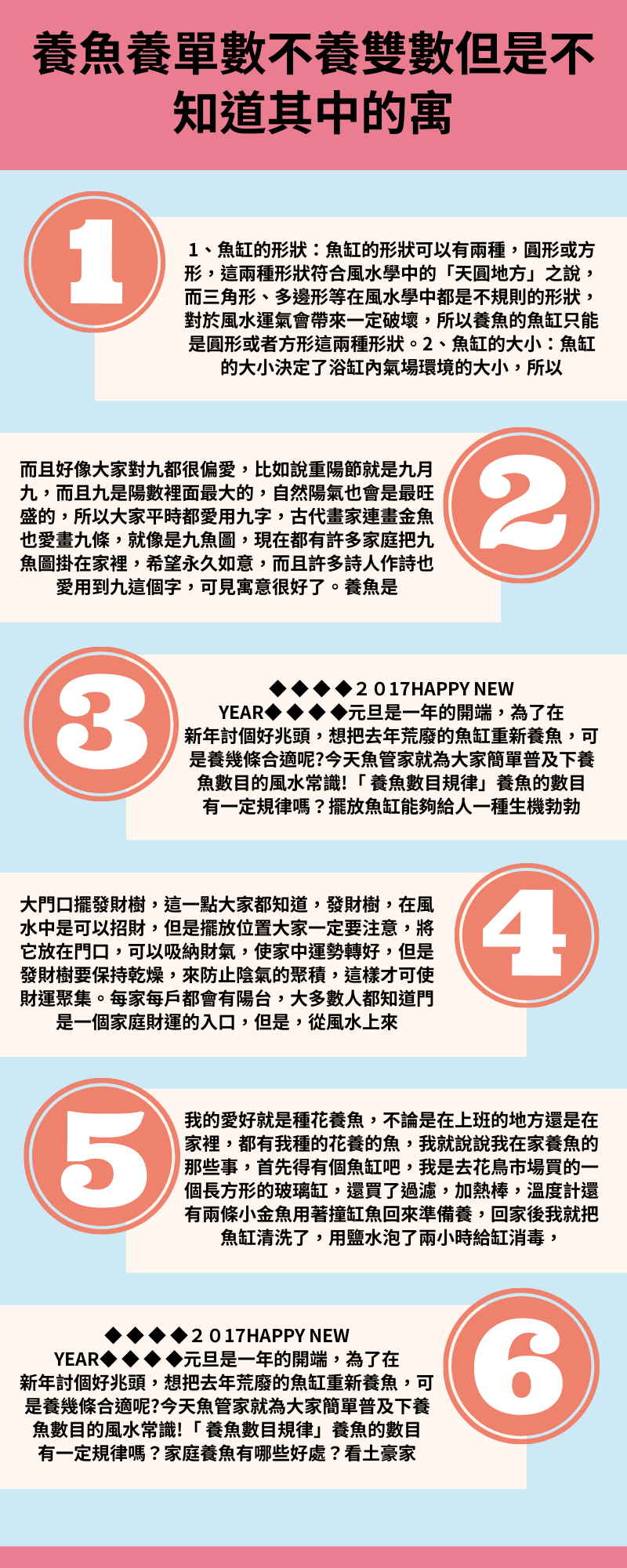 現在有朋友喜歡在家裡養風水魚。養風水魚,這是大家能詳改運方法。風水魚,不但能家中帶來多生機,能家中帶來運。很多人認為養魚數目單數吉,如一、三、五、七、九;雙數,如二、四、六、八、十,這些人雙數;雙字傷字諧音,故云不吉。