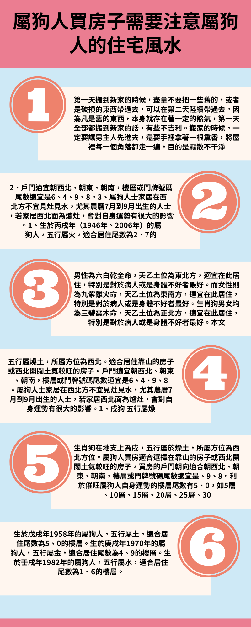 屬狗人買房適合選擇靠山房子或西北開闊土氣房子,買房戶門朝向適合朝西北、朝東、朝南,樓層或門牌號碼尾數是、9、8。