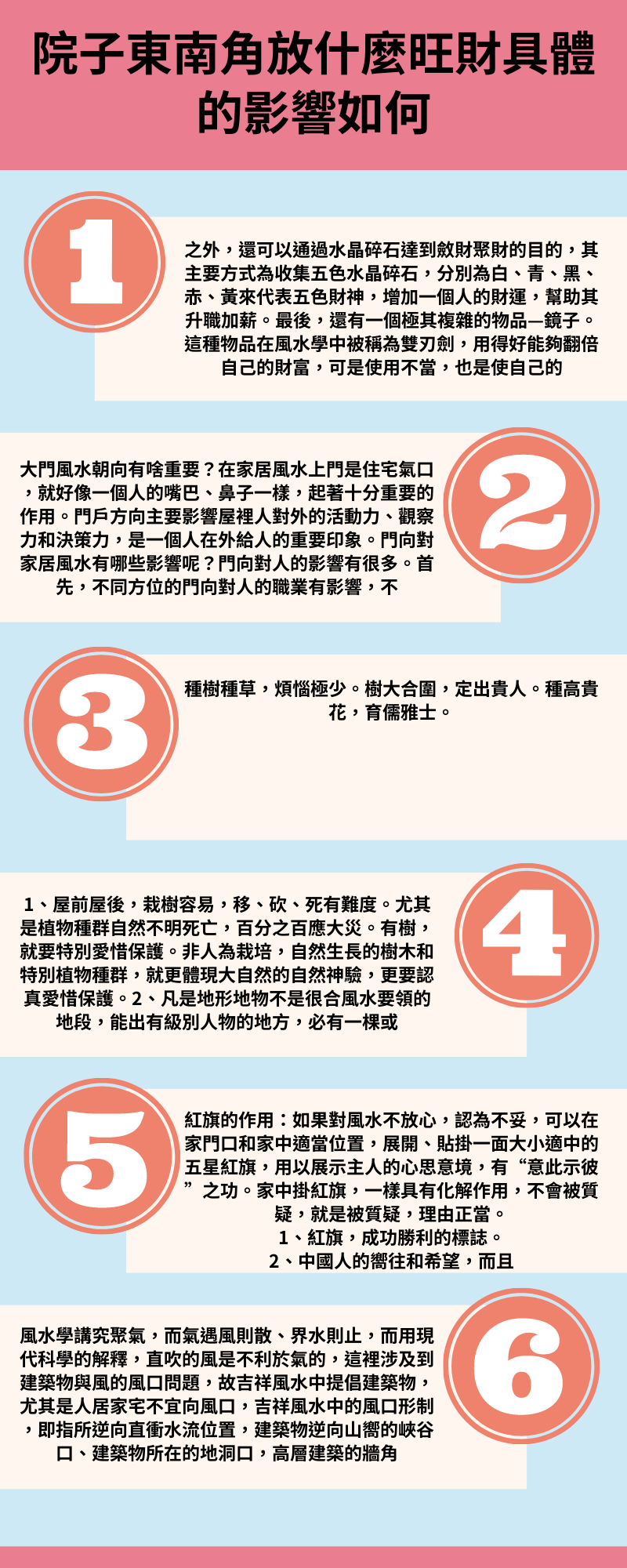 想要財,需要住宅和院子內找到整個區域內生機點,問題而言東南角說法是錯誤,每個院子會因為個體差異導致生機點位置,斂財物品放到錯誤地方是會起效果。