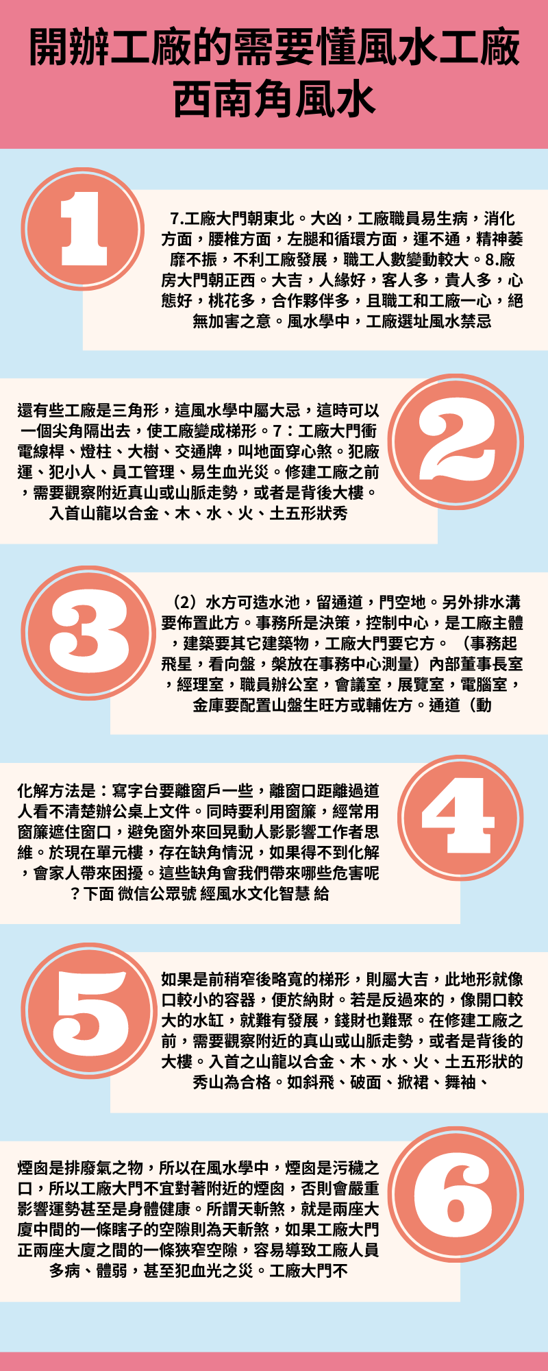 1.廠房大門朝西南。吉,技術,利貴人、生財源,管理,易產生爭執,工廠易有工傷、官司,職工變動。