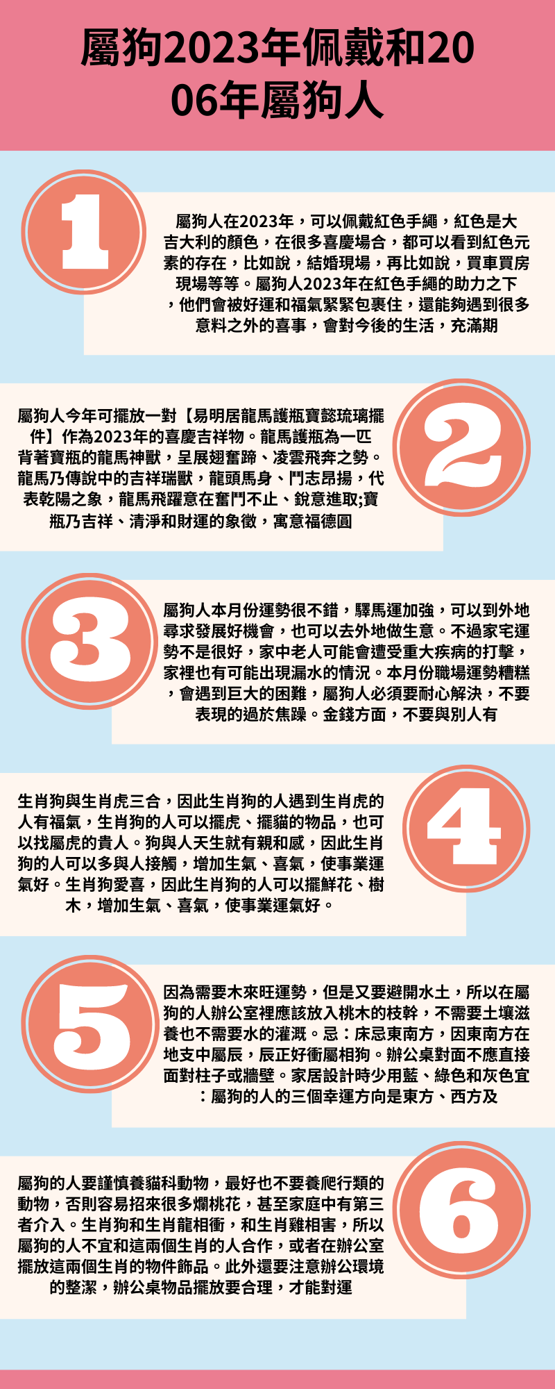 進入2023年,於06年屬狗人,這一年他們17歲了,合太歲年份中,一切事情順風順水,可以屬狗人預想方向前行。於屬狗人,這一年是即成年前一年,內心會熱情,會成年後生活,期待嚮。加上這一年屬狗人運勢,所以每一天會過得開心。屬狗人今年可隨身佩戴一個【易明居龍馬護瓶吉宏吊墜】作為2023年吉祥飾物,寓意運勢、歲歲,祈福全年吉利,福星高照,福運連連。