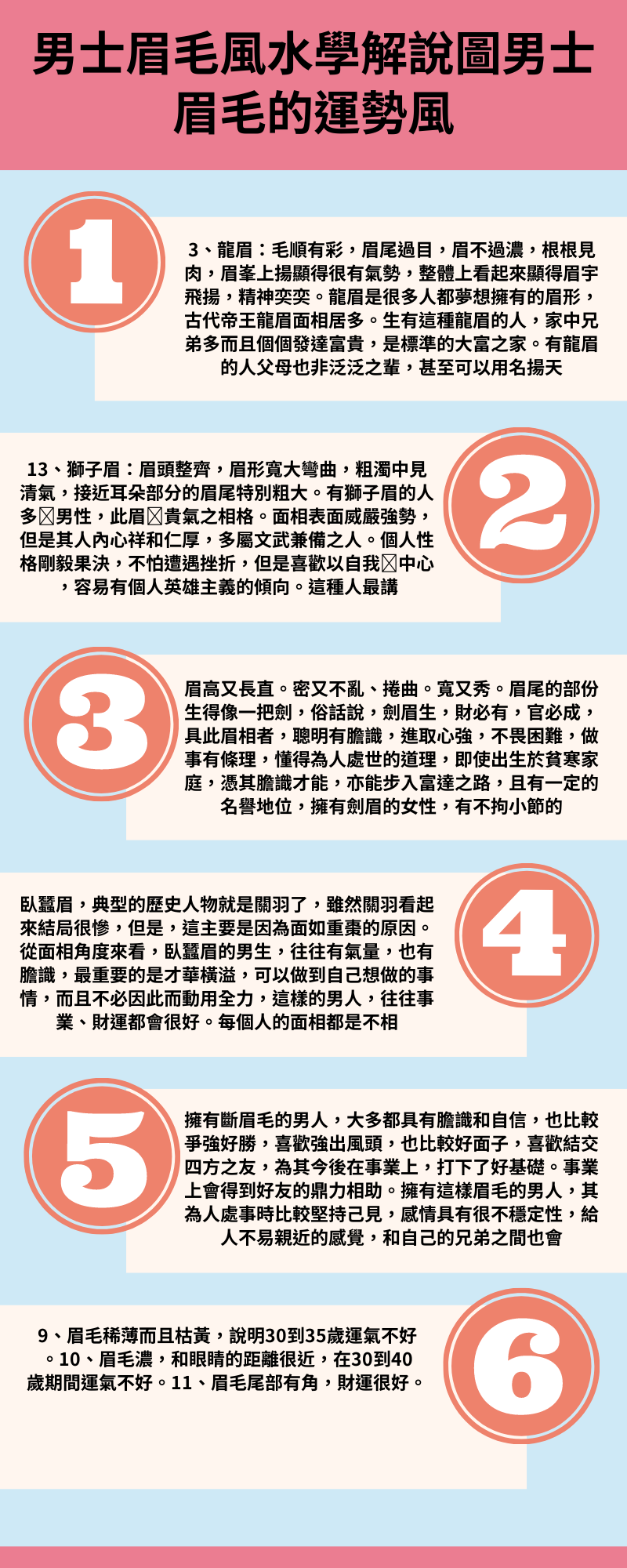 眉毛,是可以看出一個人人緣,男人眉毛,女人眉毛,這是,眉毛代表側於做大事,做事衝動。脾氣。你他,即使小小的爭拗,可以很鬧一場。如果眉毛過及眉形過,男人代表好色、怕老婆,一生會有一次獄災,同時指會配比自己年齡老婆。如果眉再配上兩眉,那你要小心,凡事他會斤斤計,他小事而動怒。因此,眉毛,帶我們影響會有所不同。