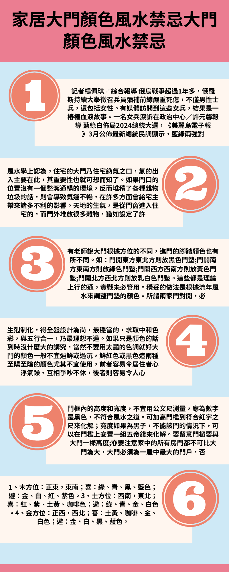 大門顏色過或過沉,鮮紅色或黑色這兩種陽至陰顏色使用,前者令居住者心浮、爭吵不休,後者令人心情、。