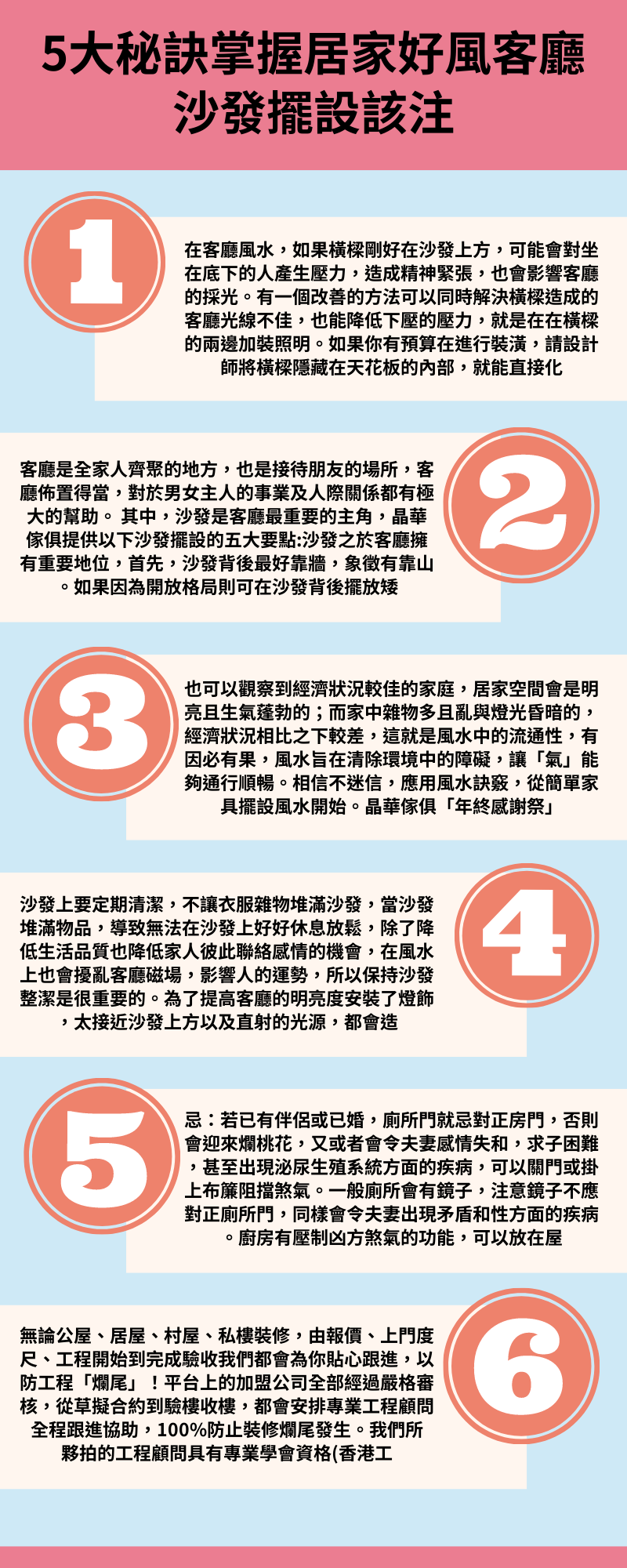 客廳風水上,專家指出空間運用配置顛到話,會導致退財格局,使家中財運走下坡。因此不管是透天客廳擺設或是電梯大樓客廳,規劃家中格局或是買房時候要注意客廳是否整個家後方。