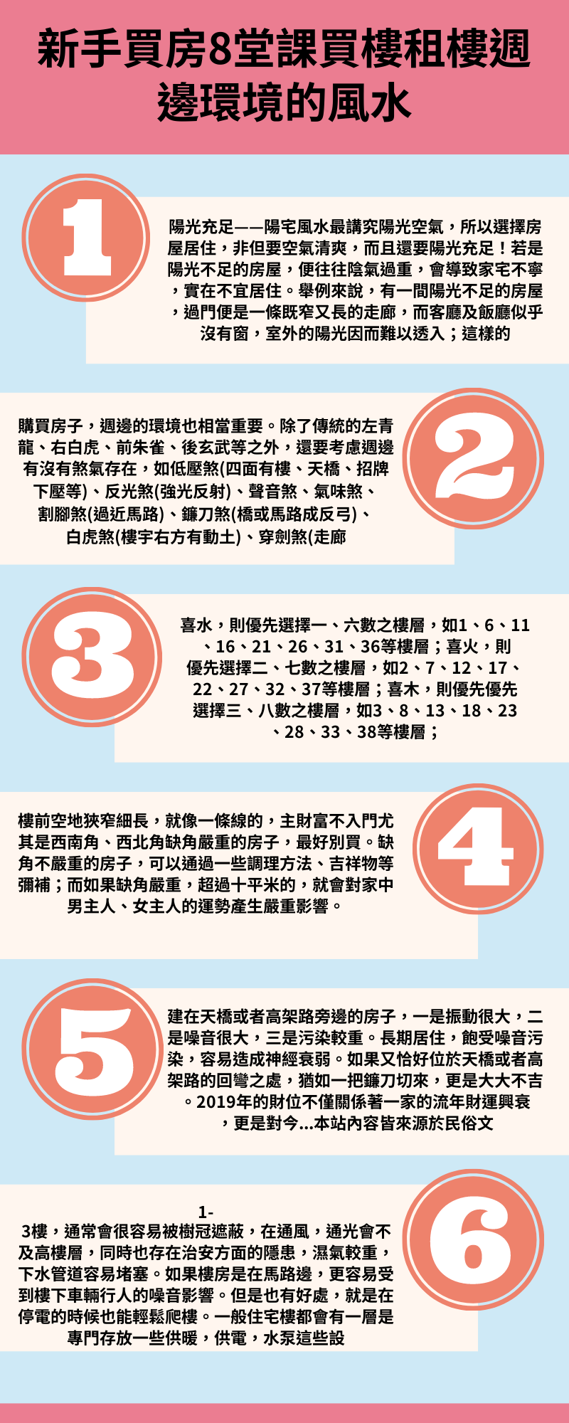 上表彙整八大要點風水上可能造成影響及建議應方法,但不用過度迷信、建議購屋時實際屋況及居住需求主,留意居家風水問題相信有助您順利買到房子。