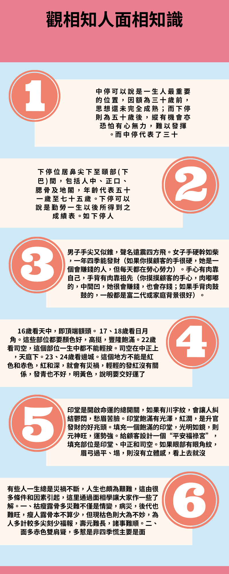 我們人看面相時候,要口訣判斷顧客吉凶禍福、財富、婚姻、家庭、事業、兒女。男子麵相看五官(五官是否端正,五嶽是否貢,是否三三相連),女子麵相看流年(看氣色,是否凹陷有疤痕)。