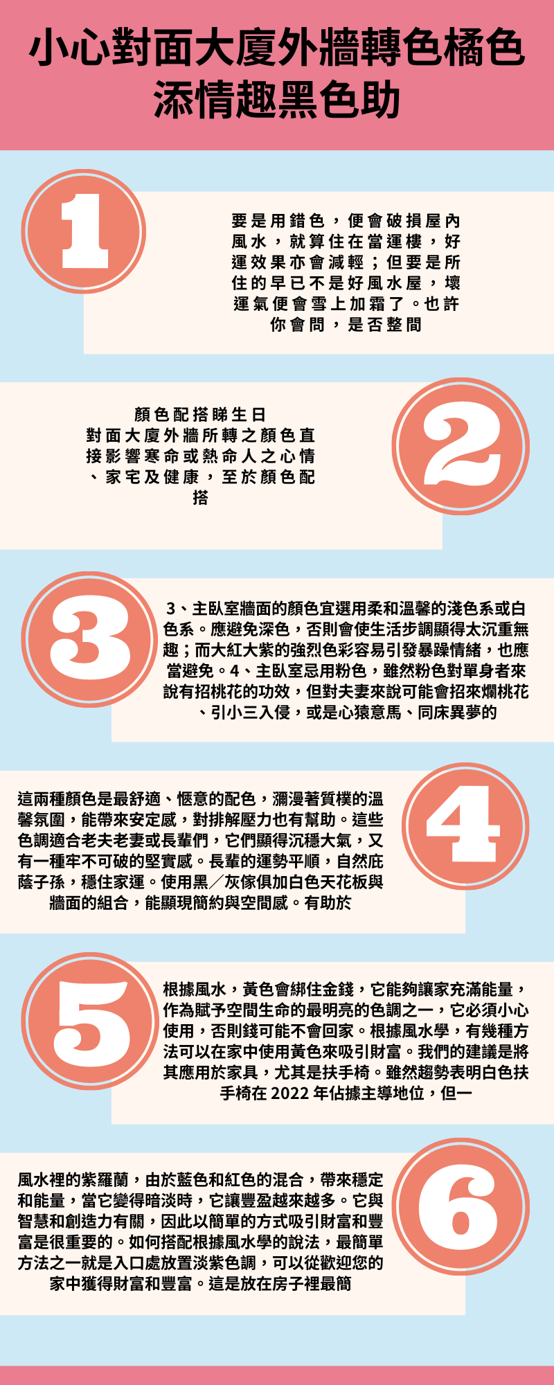 要 是 錯 色 , 會 破 損 屋 內 風 水 , 算 住 當 運 樓 , 運 效 果 會 減 輕 ; 但 要 是 所 住 是 風 水 屋 , 壞 運 氣 會 雪 上 加 霜 了 。