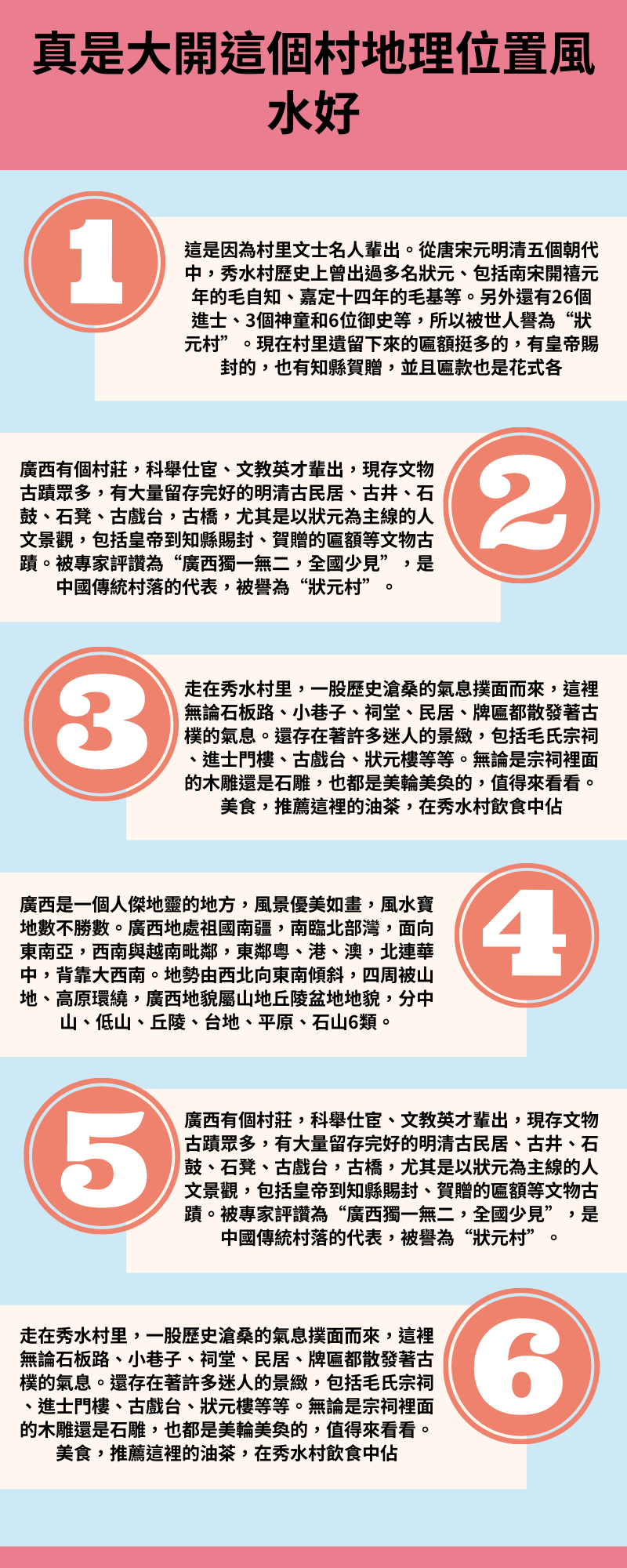 廣西有個村莊,科舉仕宦、文教英才輩出,現存文物蹟眾多,有大量留存明清古民居、古井、石鼓、石凳、戲台,古橋,是狀元主線人文景觀,包括皇帝到知縣賜封、賀贈匾額文物蹟。專家評讚“廣西獨一無二,全國見”,是中國傳統村落代表,譽為“狀元村”。