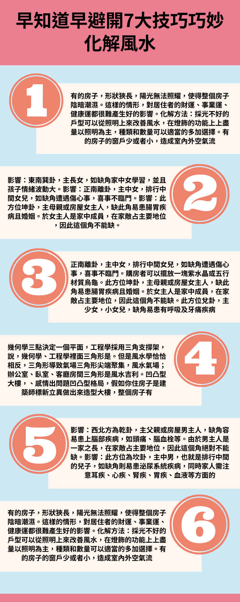 化解方法:鋸齒型戶型問題尖角多,於主人運勢,可以種植開運植物,放置紫水晶等開運石。鋸齒式房間,使用平面鏡覆蓋整面牆,可以造成房間延伸感,並且朝向鏡子空間填進凹陷處裡,令空間看起來至於過分逼仄。