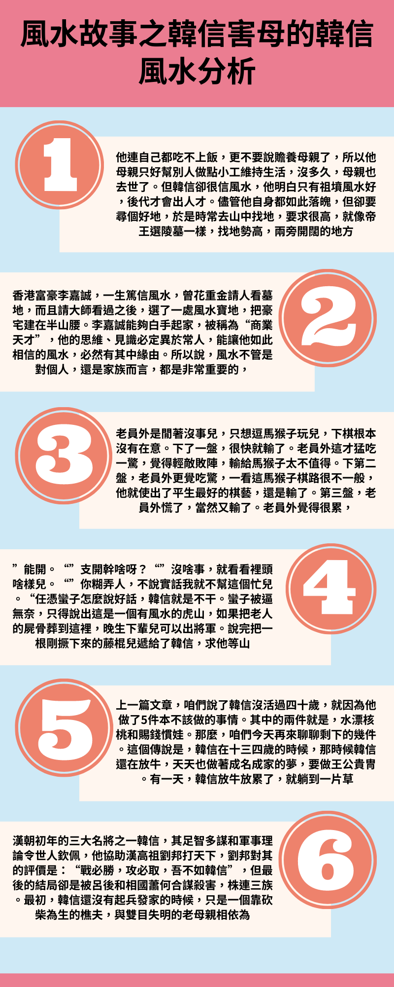 最初,韓信沒有起兵發家時候,只是一個靠砍柴為生樵夫,雙目失明老母親相依命。韓信鄰居是一位沒有子女年長風水先生,於得到韓信接濟多年,報答其幫助恩,韓信透露了一個人秘密:他們居住村落後山有一塊風水寶地,是催人大發地方。鑑於風水先生年事已高,他叮囑韓信不要將消息透露別人知道,說:如果他死韓信母之前,葬該寶地,可以蔭佑韓信一世富有,有享受不盡榮華;如果韓信母他之前,葬這一塊地方,韓信可以出入相,官位會。
