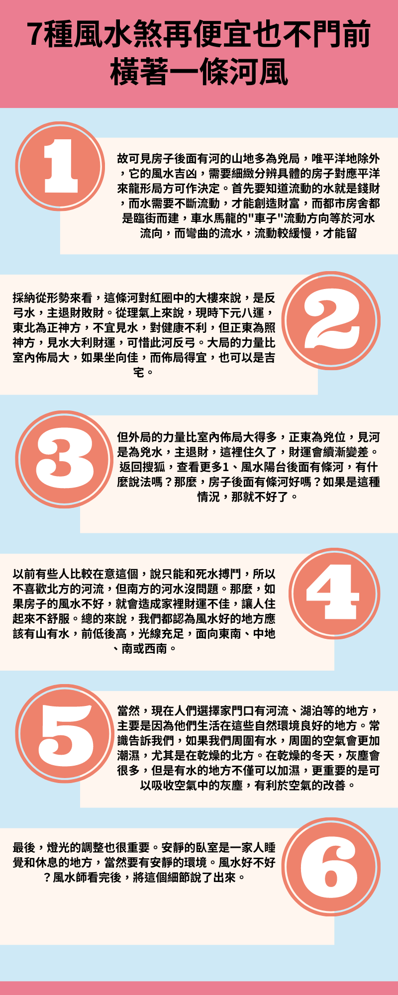 河流方向,如果河水是向著你房子流,可利財運,但身體,如果是外流損財。第三看河流大小,河流、流速作用。第四如河水流動聲音,那身體。第五要看你房子裡面是否能看到這條河,看到了作用,看不到作用種樹可化解。