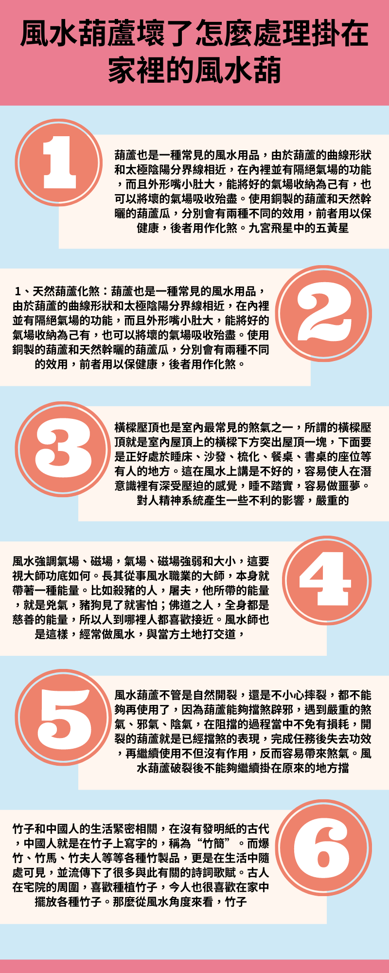 風水葫蘆破裂後不能夠繼續掛原來地方擋煞,沒有化解煞氣效果,而且裂開葫蘆於作用盡失,化解煞氣和邪氣有可能會洩露出來,如果家裡人體質比,這些病會入侵到身上,導致受到損害,生病,會發生意外事故。