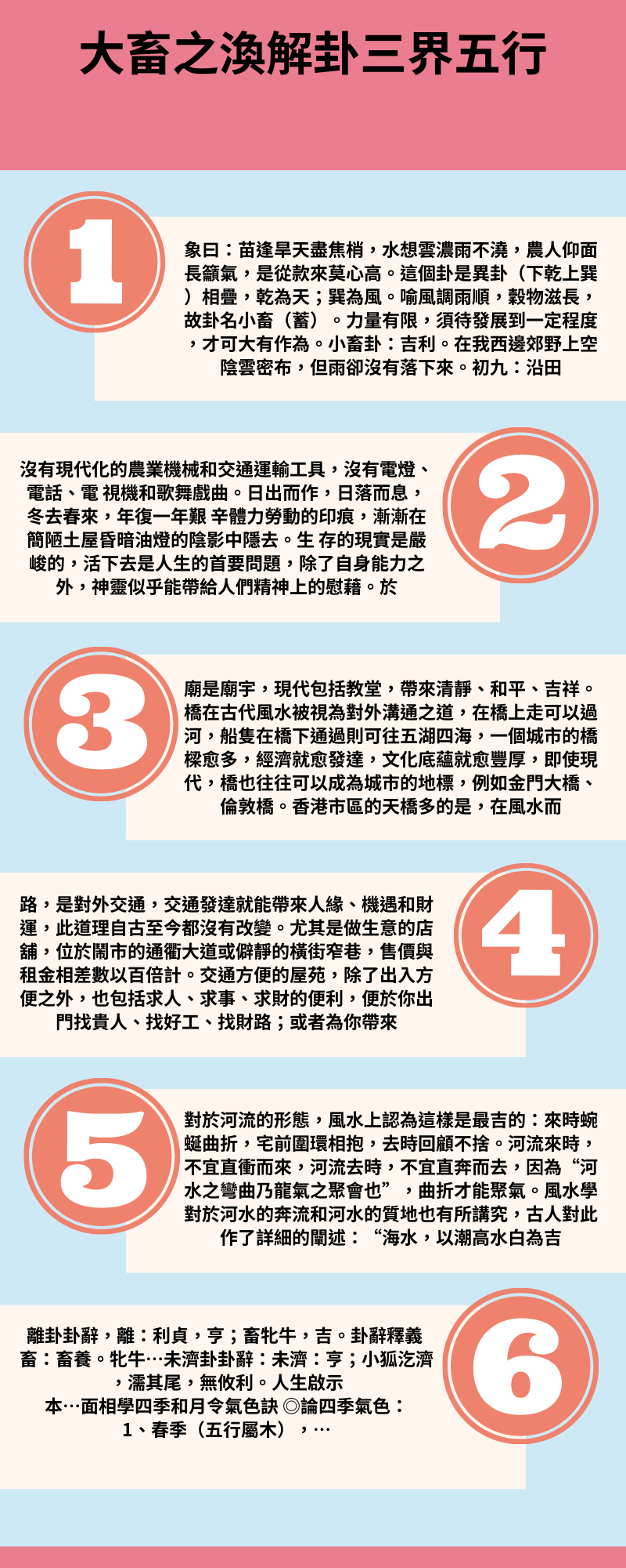 路是外界溝通要脈,現代,交通往往是首要考慮。井是水源,現代有自來水,井概念可涵蓋噴水池、泳池、水渠、湖海江河。廁,古時廁所設室外,現在這概念存在。畜是畜牲欄,古時,「家」字寶蓋頭下是「豕」字,「六畜興旺」、「五穀豐登」是農業社會祝福,現代都市沒有這回事,我們可以解讀生命、成長,學校應該屬於這個概念,名校區住宅價值,不用多說,你懂。