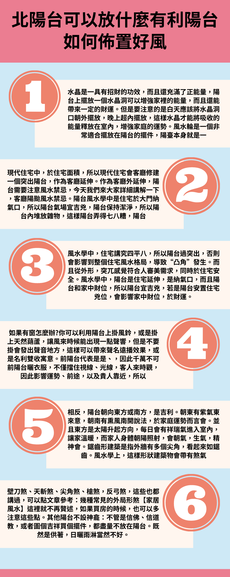 風水學中,陽台是住宅延伸,是納氣口,而且陽台和家中財位,所以陽台宜吉,若是陽台安置住宅兇位,會影響家中財位,於財運。