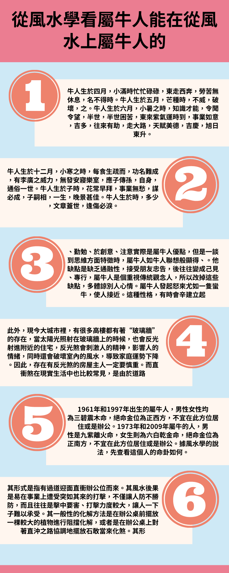 牛年出生人命運概要:天貴星,性格,事宜德,此人誌願,利慾心,有成就,且有積蓄財富,一生多,不過貴星多,防欺人太甚,到時會如命理所說:”四貴克子孫”,多人和睦,到中年運到來風調雨順,一切所謀遂意,到老年萬事達到境界,此時得榮華富貴,若逢破星克命,雖會吉。