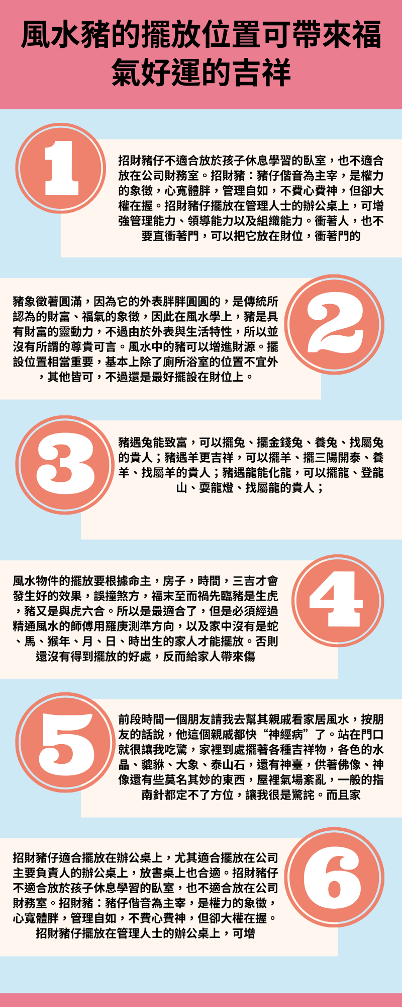 豬守財聚財鎮宅效果加倍,是鎮宅吉祥幫手。風水學上,豬是具有財富靈動力。祭拜中有豬出現,取其增進財源意思,我們可以選擇家中或工作場所放置風水豬來財源。於是求財,所以風水豬擺設位置,基本上廁所浴室位置外,其他可,不過是擺設財位上。於了求財,風水豬質材金屬(如銅)最上,才能完全發揮招財能力