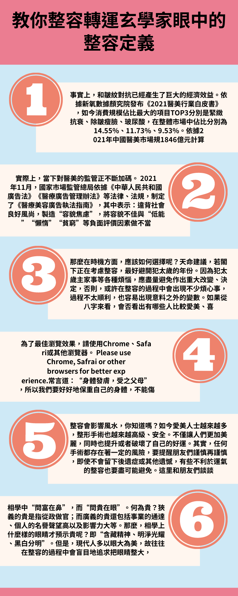 玄學角度看,微整容無傷大雅,但如果是入侵式(例如隆鼻、隆胸、削骨、開眼角),是有如「血光災」,應三思後行。若下定決心進行此類手術,要小心,自己個人八字、運程分析,挑選自己好運日子去做,失敗率能大大降低。