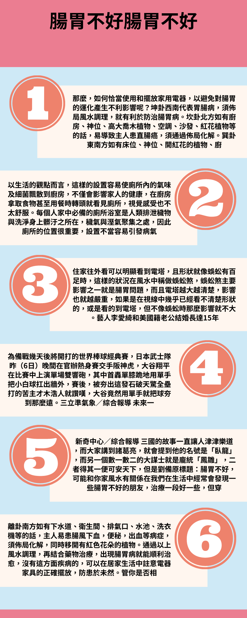 現代人生活步調,加上3餐時,許多人有腸胃方面毛病,壓力、飲食及個人體質外,其實居家風水會造成程度影響,導致病產生。