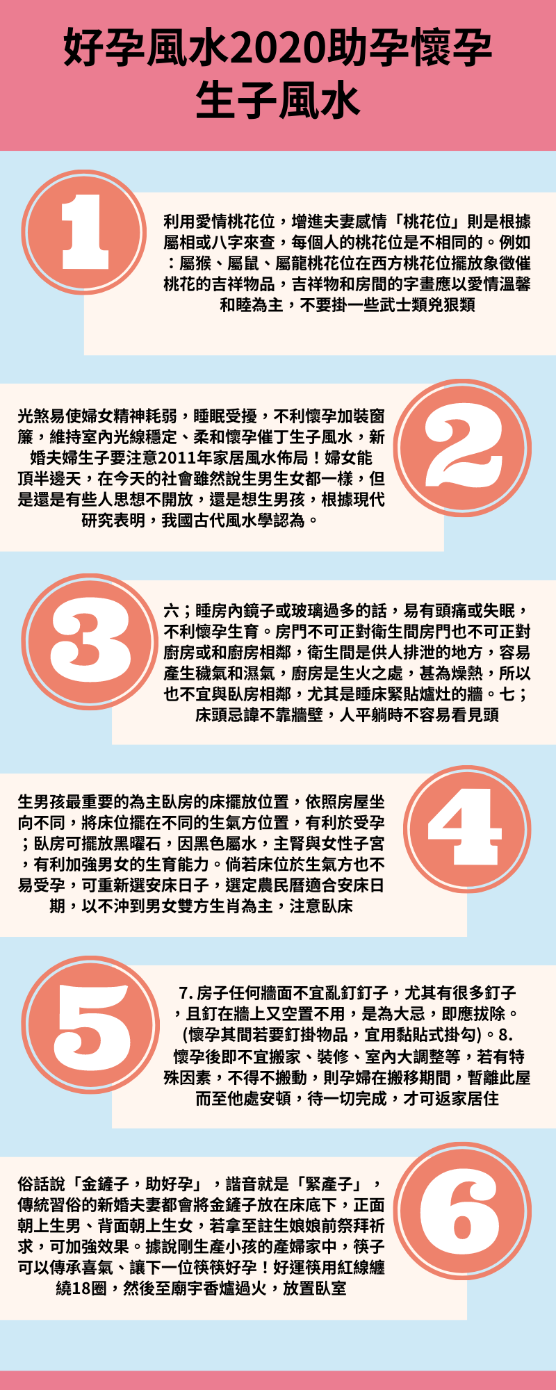 自己睡覺臥房,擺設一些助孕小物,例如 : 百子圖、百子盤或嬰兒海報增加旺氣,若擺放成雙麒麟風水物象徵男丁,幫助睡該臥房人有懷孕機會。