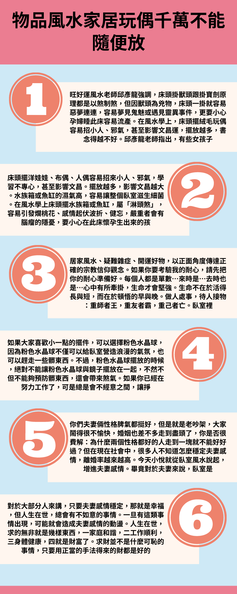 臥房中大忌,其中之一「玩偶煞」,有動物或人類眼睛物品,包含掛畫、娃娃、玩偶、佛像、聖母像、戰車兵刃模形,另外包含卡通圖案掛畫、裝飾品、文具、衣服、床單日用品。若上述物品數量過多,不僅工作運不順常犯小人,升官輪不到自己,感情和人生,破財。紫蝶老師接觸到一些感情、有離婚經驗客戶,發現他們房間內有大量卡通、娃娃公仔。