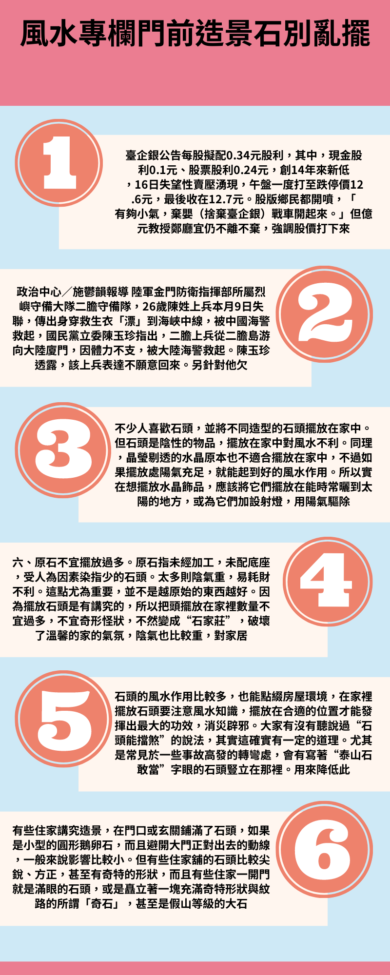 有些住家講究造景,門口或玄關鋪滿了石頭,如果是小型圓形鵝卵石,而且避開大門出去動線,來說影響。但有些住家舖石頭銳、方正,有奇特形狀,而且有些住家一開門眼石頭,或是矗立著一塊奇特形狀紋路所謂「奇石」,是假山等級大石頭,會有影響,是移到其他地方擺設觀賞。