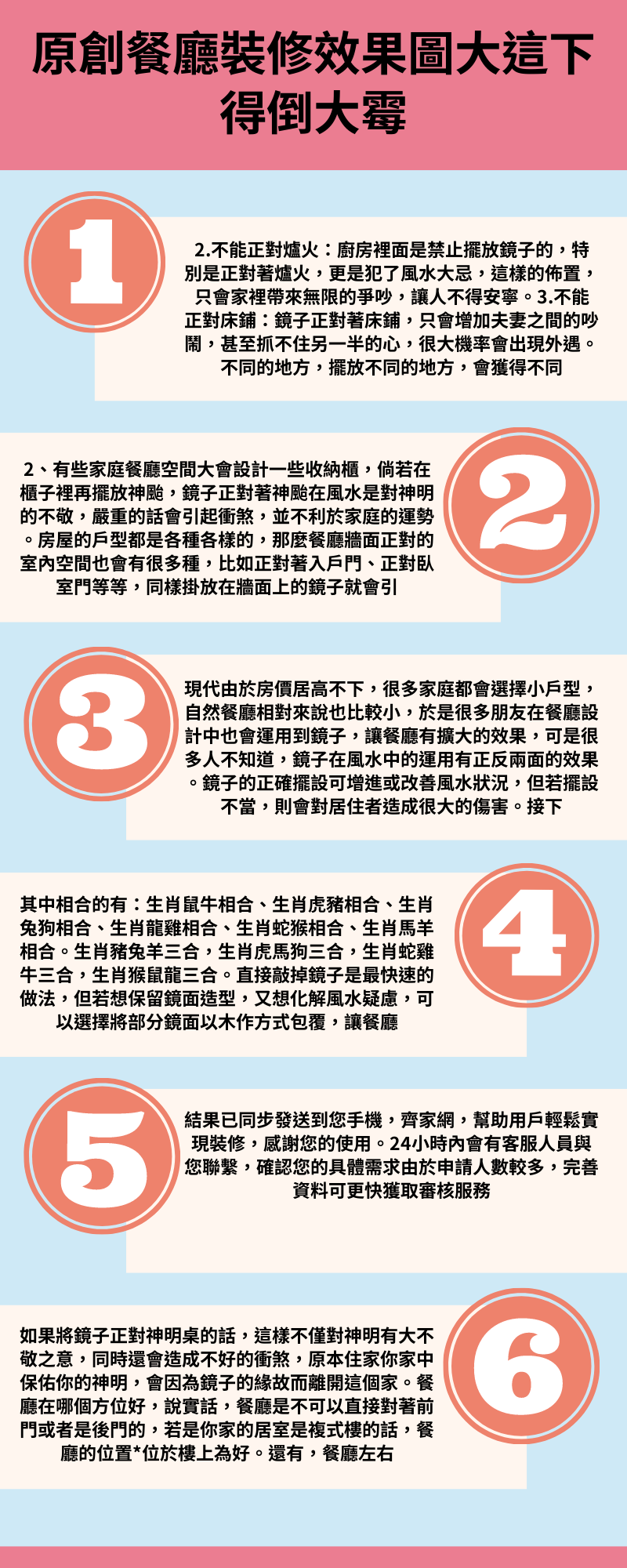小編結語:以上為大家介紹了餐廳鏡子擺放風水講究,因為鏡子忌諱多,如果什麼話,不要裝鏡子安全。如需了解關知識,請繼續關注齊家網資訊平台。