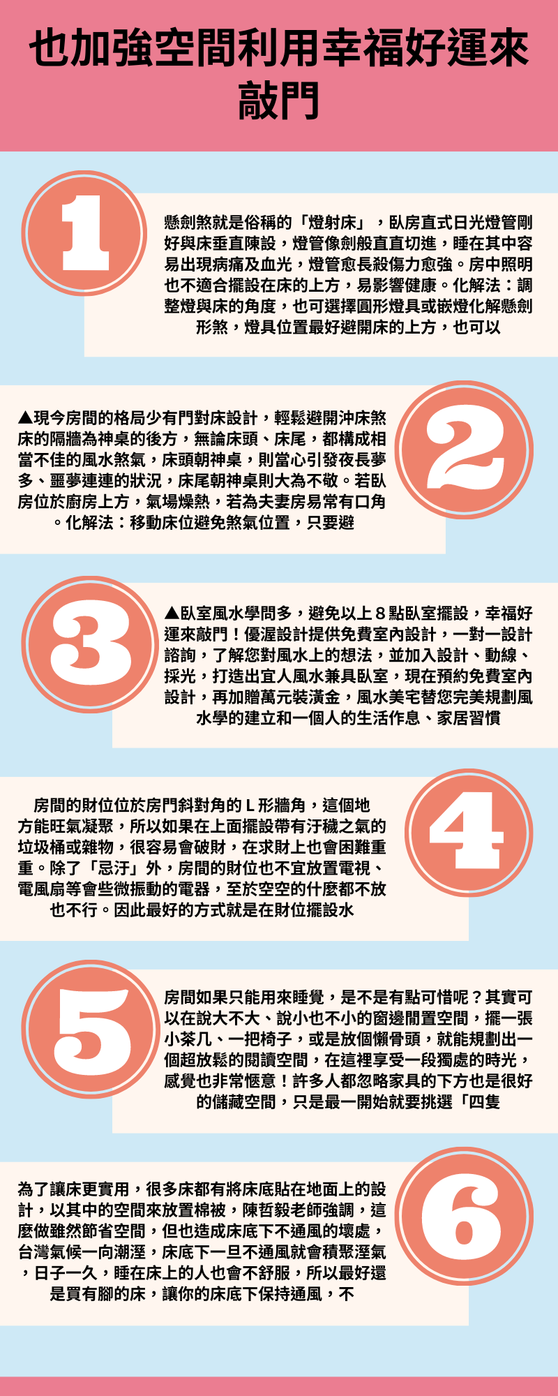 床位置要避開窗、門,理想床位符合臥房主人命卦外,房門離得愈,儘量不要門、窗。