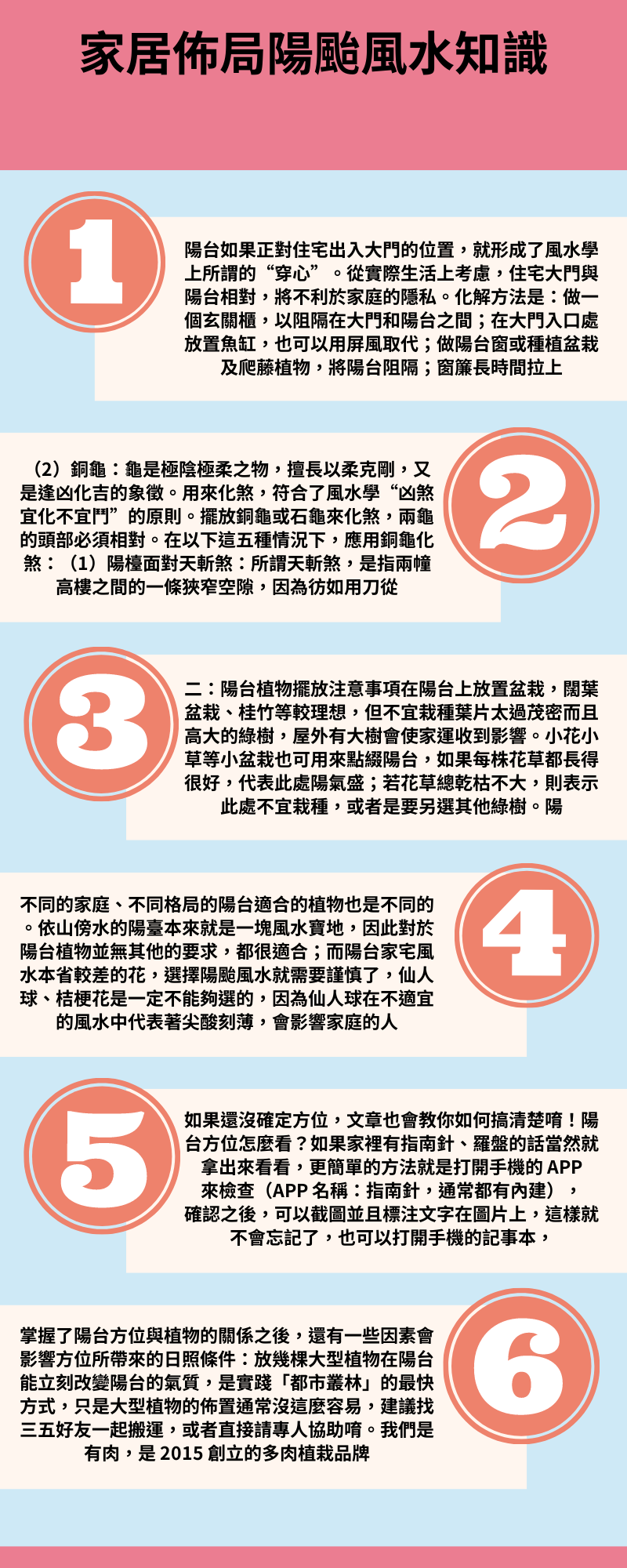 二:陽台植物擺放注意事項陽台上放置盆栽,闊葉盆栽、桂竹理想,但栽種葉片過而且綠樹,屋外樹會使家運收到影響。小花小草盆栽可用來點綴陽台,如果每株花草得,代表此處陽氣盛;若花草總乾枯,則表示此處栽種,或者是要另選其他綠樹。陽台衝廚房,宜通道處放置植物化解煞氣,該處放一盆黃金葛可以收到風水效果。如果陽台正對著一面沒有形成煞氣物體,不要種植、擺放有刺植物。因為這些植物化煞之餘散發出霸道氣,會影響人運勢。例如,鐵樹、漆樹風水上他們招致屋主筋骨酸痛,有受傷情況發生;松、柏針葉植物會使屋主聚財。陽台西邊種植水耕植物,因為這樣會導致漏財。如下圖