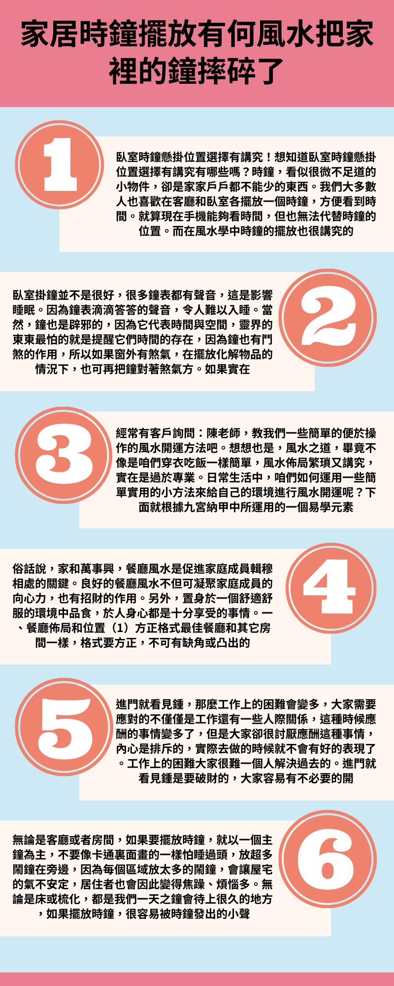 無論是客廳或者房間,如果要擺放時鐘,一個主鐘主,不要像卡通裏面畫一怕睡過頭,放超多鬧鐘旁邊,因為每個區域放多鬧鐘,會讓屋宅氣安定,居住者會因此變得、多。