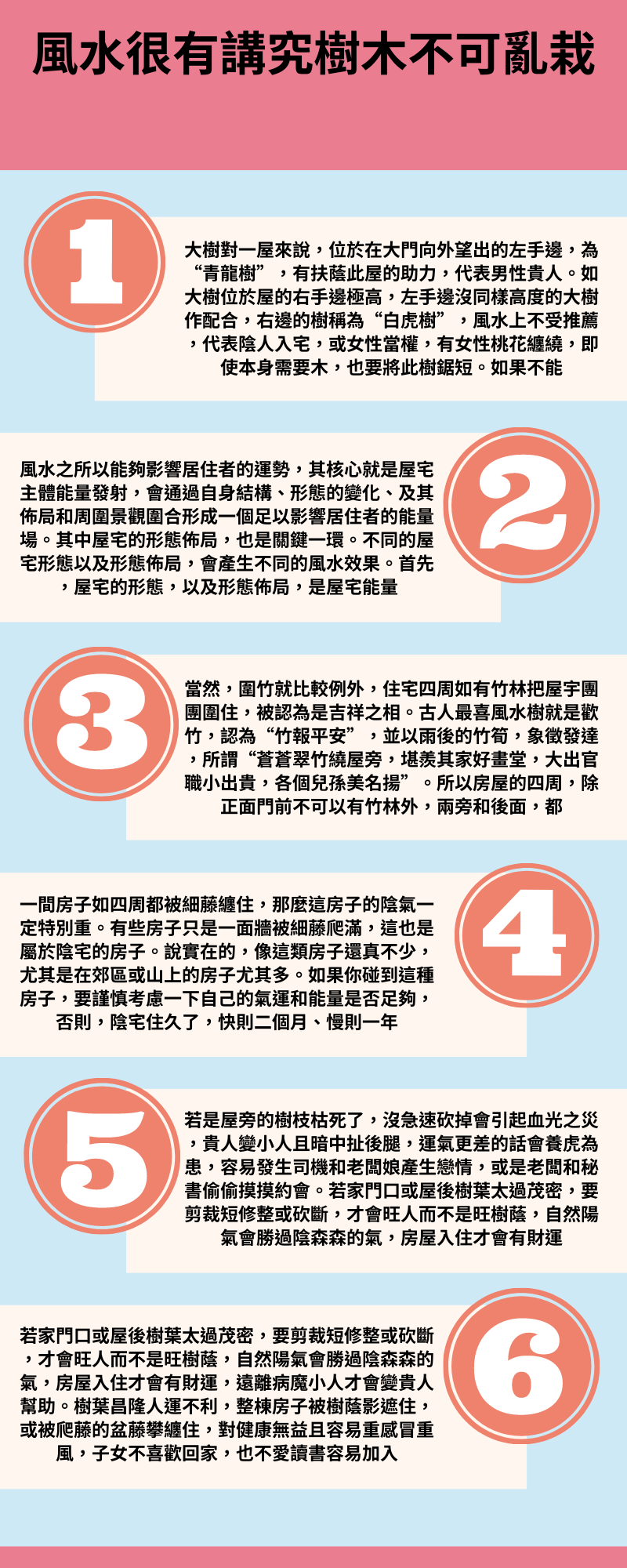 如樹位於窗邊,要留意樹枝是否如“叉”窗戶發展,是話,會影響眼睛,導致生眼瘡或眼疾。如樹枝沒有直伸向窗戶,窗旁樹是可以接受。不過可以選擇話,樹木應家宅窗戶及大門保持一段距離,影響風水及空氣流通。擁有私家花園人,如喜歡多種植樹木,盡可能不要接近住宅位置,種植樹叉植物,要留意讓樹枝伸向住宅方向。屋旁種植軟性樹葉、非大樹,可營造風水環境。一株大樹能否帶來風水,視乎大樹是否坐於青龍方,及樹形態是否帶來衝煞,取決於大樹方位,是否對家族成員造成影響。舉例,如有夫婦二人渴望求子,家宅東方好長了一株大樹,而且得,這一種是風水,大利家中男。反過來,如父親忌木,西北方了大樹,不吉反兇,代表家中男主人受到製肘,阻力,假如無法移走大樹,唯有搬屋,否則男主人一輩子行衰運。因此,屋旁大樹,是一種風水。