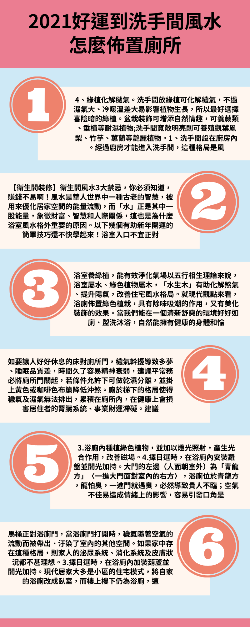 居家裝潢中,廁所是排汙功能性區域,空間於客廳臥室區域,原則裝修設計,但每天會用到衛浴廁所空間五行中屬水,風水中是重視一塊,設計影響著居住者和運勢。