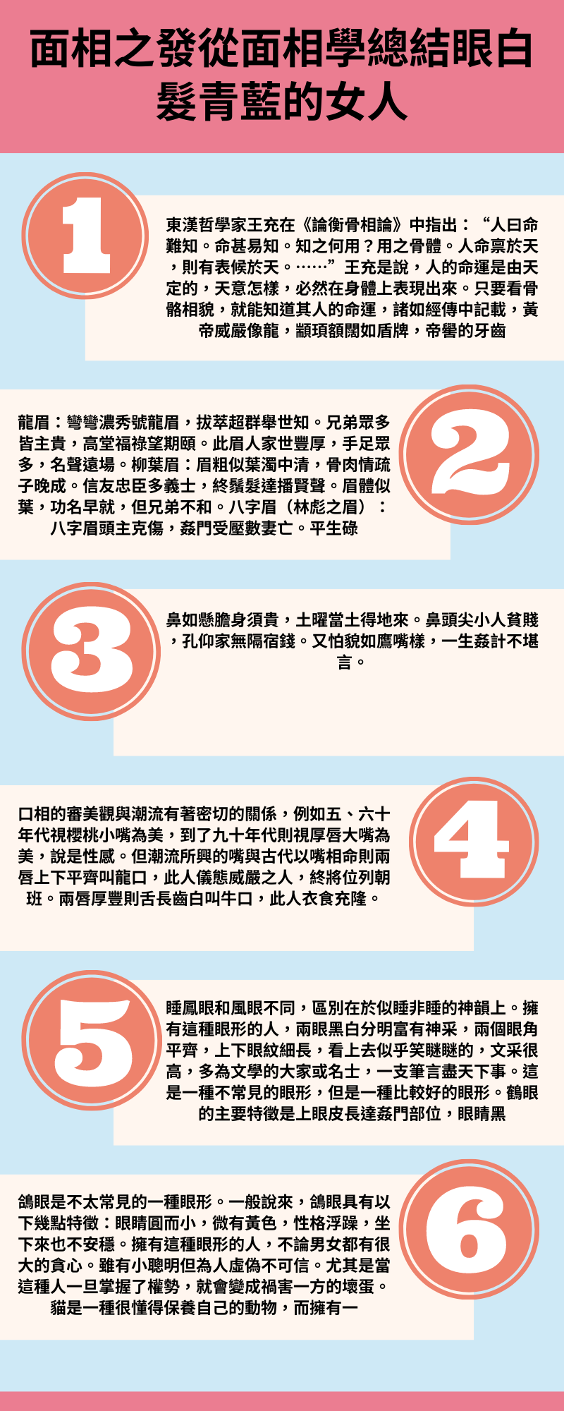 總體,頭髮宜、宜黑、宜疏,有了以上三種可富貴福壽。如絲者,則夫妻和睦;發稀而細,;而潤澤,此人,如加上眉目清秀,功名有望;相反頭髮忌、忌、忌,此種人則多數貧寒夭折,如果頭髮,夫妻會和睦,男女剋;發黃焦枯,;如果孩童時候頭髮話,該孩童多,發腳低則運氣多滯,落髮,有傷財之患;髮捲,有刑傷;如果發如麻,窮苦多磨;髮額,命矣。