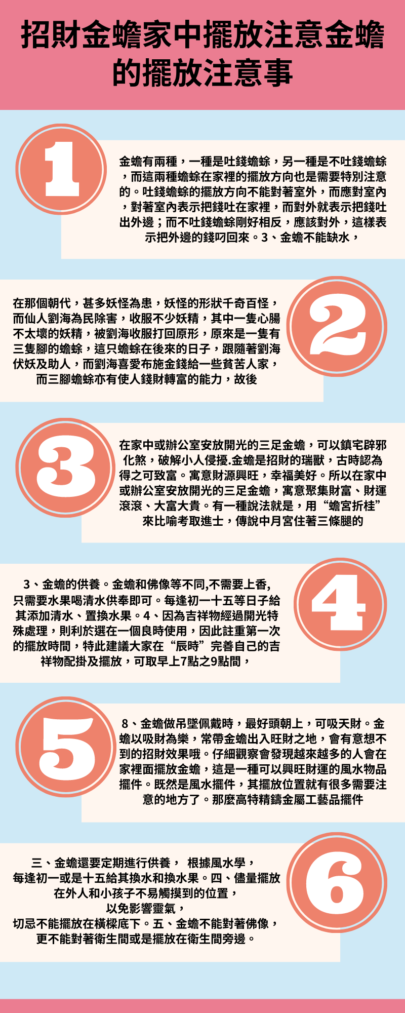 金蟾放在陽台,要注意放置方位,各個家庭陽台有著朝向。我們會金蟾擺放位置如財位、福位這些地方。這些方位見得每個人懂,可以找專業人員到家裡面來看看。
