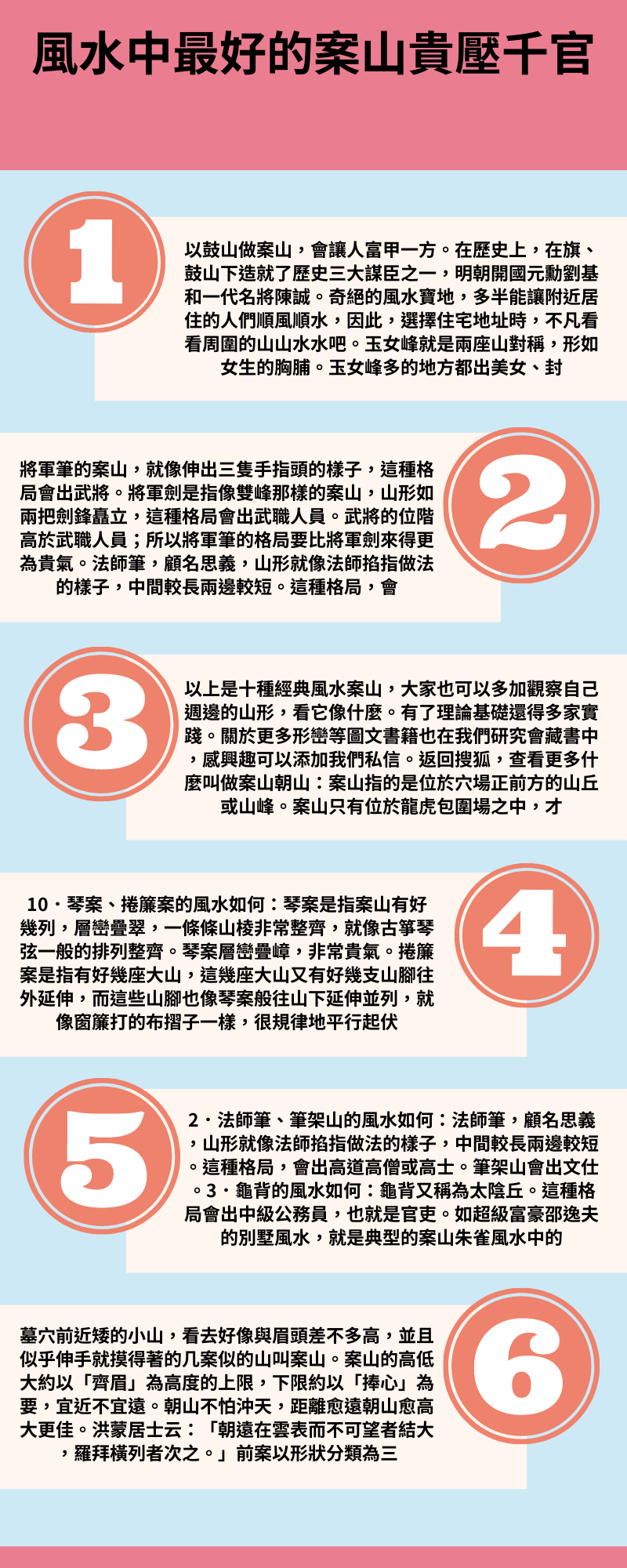 楊公風水中,會反复提到一句話:七分形,三分理。由此可見祖師爺於形巒風水重視。一個穴位要結合形勢,要結合理氣。很多人初學風水時,會閱讀大量書籍,有些是專門形巒有記錄圖案知識,有些是理論知識古書籍。幫助大家學習形巒,總結了以下風水中出官十大案山。